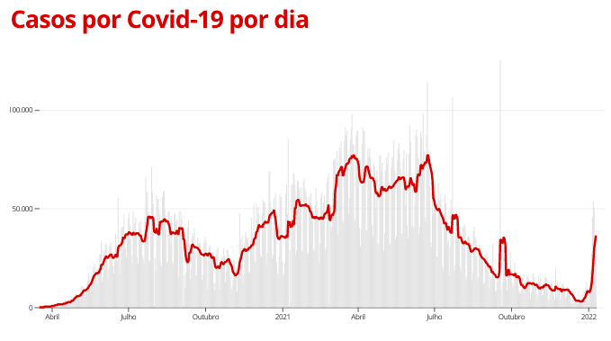 Com isso, a média móvel de casos nos últimos 7 dias foi a 36.227 – a maior registrada desde 29 de julho do ano passado (quando estava em 44.974). Em comparação à média de 14 dias atrás, a variação foi de +617%, indicando tendência de alta nos casos da doença.