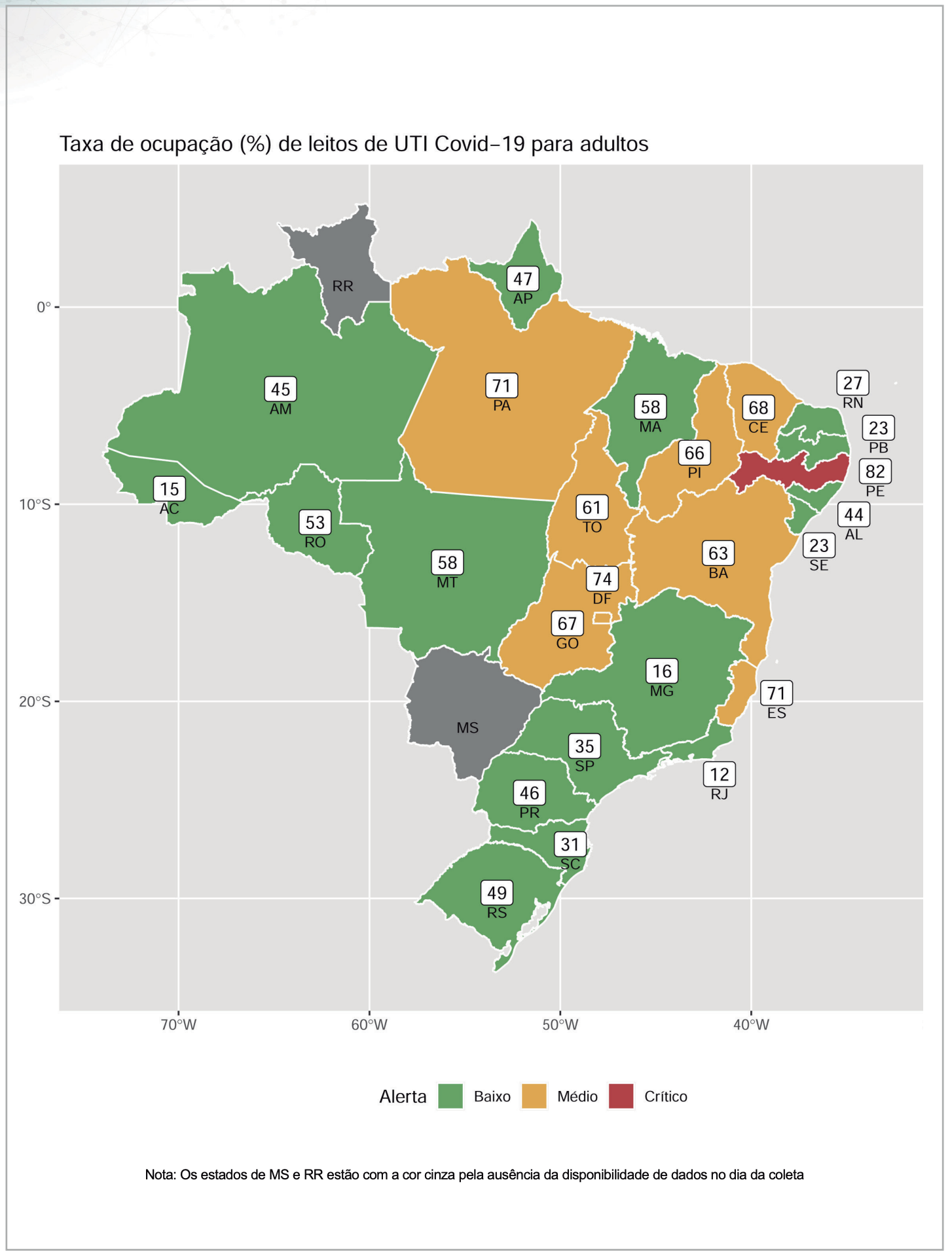 Um terço das Unidades Federativas e dez capitais encontram-se nas zonas de alerta intermediário (PA, TO,PI, CE, BA, ES, GO e DF) e crítico para Pernambuco. Cenário ocorre em meio a avanço de nova variante e colapso do sistema hospitalar com adoecimento e afastamento de profissionais de saúde.