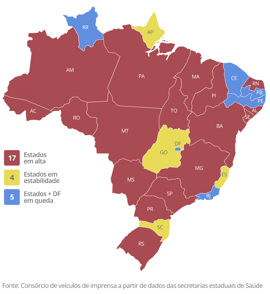 O estado de São Paulo tem o maior número de casos acumulados desde o início da pandemia, com 4,4 milhões de casos e 155,6 mil óbitos. Em seguida estão Minas Gerais (2,3 milhões de casos e 56,7 mil óbitos); Paraná (1,6 milhão casos e 40,9 mil óbitos) e Rio Grande do Sul (1,5 milhão de casos e 36,5 mil óbitos).