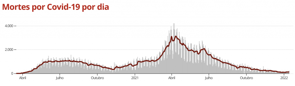 O país também registrou 251 mortes pela Covid-19 nas últimas 24 horas, totalizando 620.847 óbitos desde o início da pandemia. Com isso, a média móvel de mortes nos últimos 7 dias é de 138. Em comparação à média de 14 dias atrás, a variação foi de +42%, indicando tendência de alta nos óbitos decorrentes da doença.