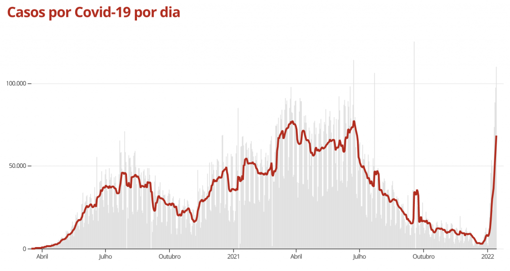 Nas últimas 24 horas, o ministério registrou 112,2 mil. Com isso, a média móvel de casos nos últimos 7 dias foi a 68.160 – a maior registrada desde 28 de junho do ano passado (quando estava em 68.231). Em comparação à média de 14 dias atrás, a variação foi de +743%, indicando tendência de alta nos casos da doença.