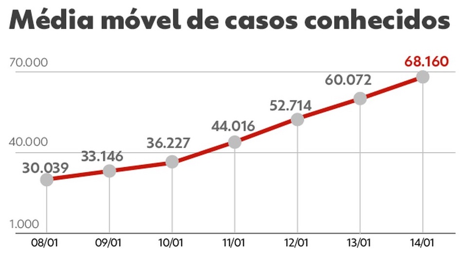 Média móvel de novos casos conhecidos passou de 68 mil por dia, próximo do pico de 77 mil de junho de 2021.