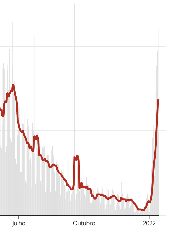 Com isso, a média móvel de casos nos últimos 7 dias foi a 68.074 – é o 3º dia consecutivo que esse número fica acima de 60 mil. Em comparação à média de 14 dias atrás, a variação foi de +792%, indicando tendência de alta nos casos da doença.