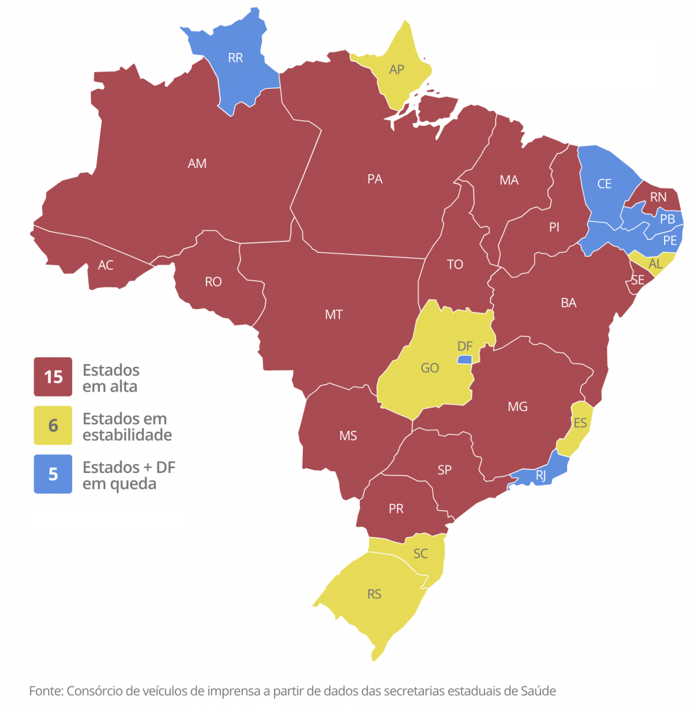 Como o Rio Grande do Sul e o Distrito Federal não divulgaram dados, são 15 os estados com aceleração de mortes (SP, RO, PA, SE, MT, MS, AM, BA, AC, MA, PI, MG, RN, TO, PR), enquanto apenas 5 mantém queda (CE, PB, RR, PE, RJ). Outros cinco estão estabilizados.