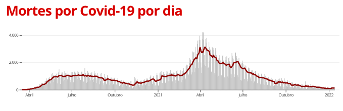 Com isso, a média móvel de casos nos últimos 7 dias foi a 83.630 – a maior marca registrada até aqui, superando pela primeira vez o pico de junho de 2021 (quando chegou a 77.295). Em comparação à média de 14 dias atrás, a variação foi de+575%, indicando tendência de alta nos casos da doença.