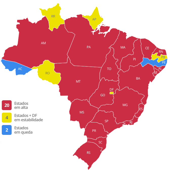 Já os estados com menos óbitos resultantes da pandemia são Acre (1.854), Amapá (2.032), Roraima (2.082), Tocantins (3.976) e Sergipe (6.067).
