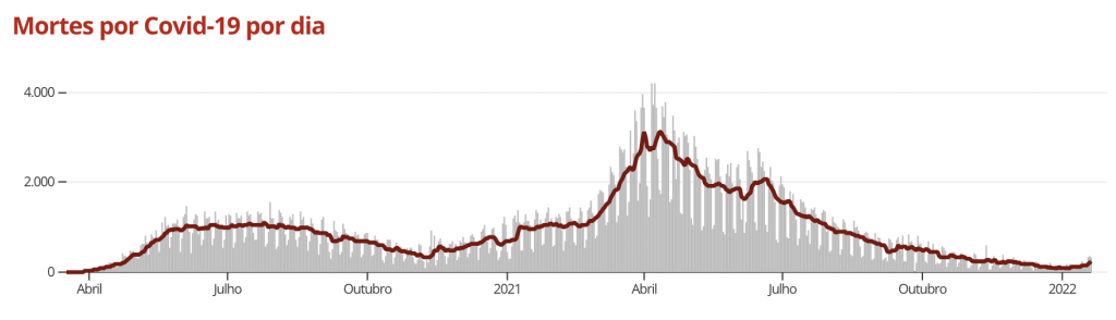 Com isso, a média móvel de mortes nos últimos 7 dias é de 235 –a maior registrada desde 17 de novembro. Em comparação à média de 14 dias atrás, a variação foi de +114%, indicando tendência de alta nos óbitos decorrentes da doença.