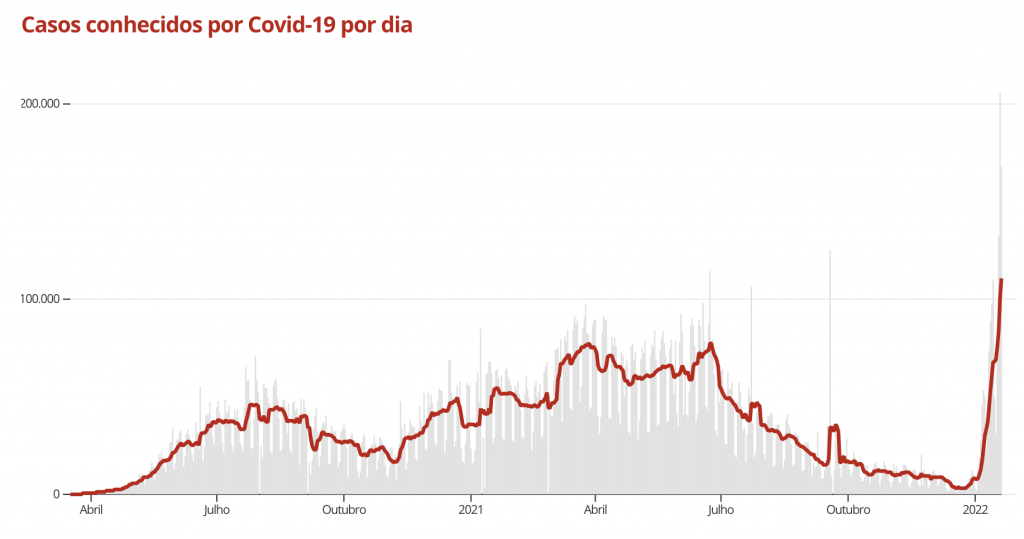 Com isso, a média móvel de casos nos últimos 7 dias foi a 110.442 – a maior marca registrada até aqui. Em comparação à média de 14 dias atrás, a variação foi de +373%, indicando tendência de alta nos casos da doença.