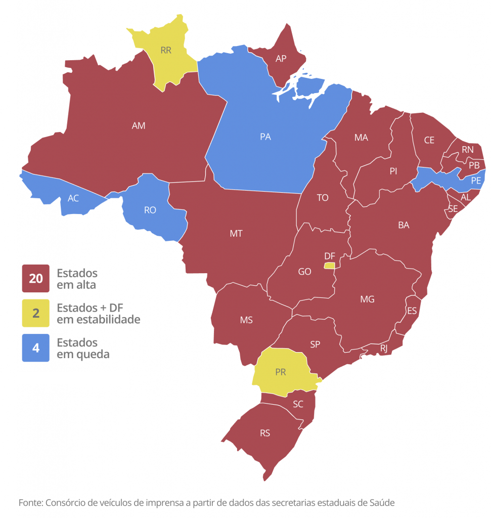 - A alta de óbitos ocorre em 20 estados (AL, SP, CE, RN, AP, MG, TO, RS, GO, SE, MS, SC, ES, MT, AM, MA, PI, BA, PB e RJ), contra apenas quatro que desaceleram mortes (RO, PA, PE e AC). PR, RR E DF estão em estabilidade.