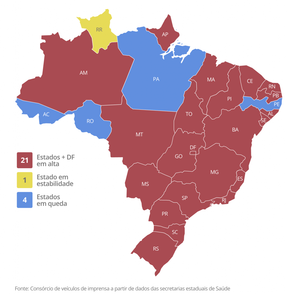 A maior parte dos estados estão com aceleração de mortes. São 21 mais o DF (PR, RS, SC, ES, MG, RJ, SP, DF, GO, MS, MT, AM, AP, TO, AL, BA, CE, MA, PB, PI, RN e SE). Restam quatro estados em queda de mortes, sendo Pará, Rondônia, Acre e Pernambuco. Roraima mantém estabilidade.