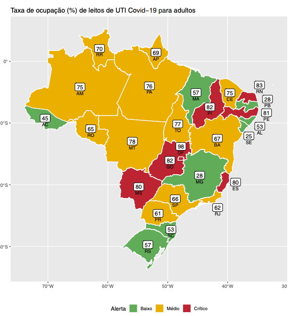 O aumento no número de internações já levou 12 estados à zona de alerta intermediário, em que entre 60% e 80% dos leitos de UTI estão ocupados. Além disso, as internações chegaram à zona crítica, com ao menos 80% de leitos ocupados, em Pernambuco (81%), Espírito Santo (80%), Goiás (82%), Piauí (82%), Rio Grande do Norte (83%), Mato Grosso do Sul (80%) e Distrito Federal (98%).