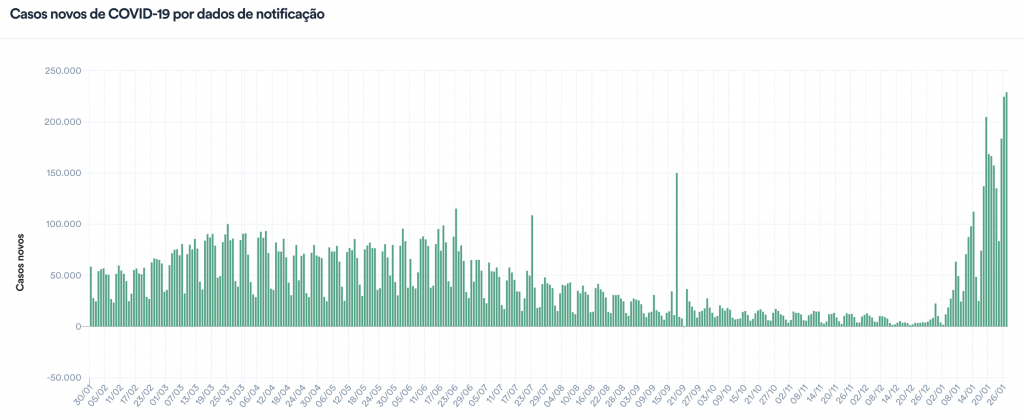 O número de casos de covid-19 registrados em 24 horas bateu o segundo recorde seguido em dois dias. De ontem para hoje, as autoridades de saúde confirmaram 228.954 novos diagnósticos da doença. No dia anterior, foram notificados 224.567 casos em 24 horas. A soma de pessoas com a covid-19 desde o primeiro caso no país alcançou 24.764.838.