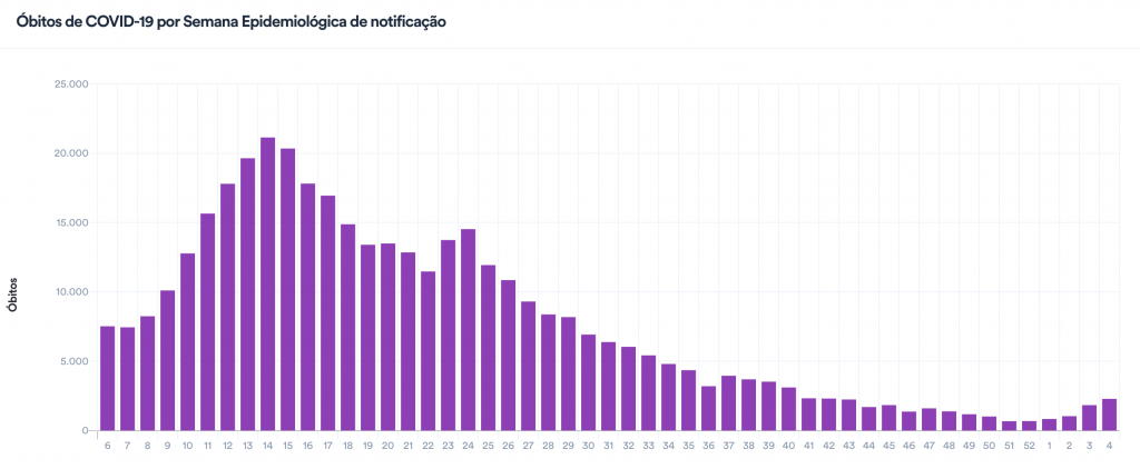 Com isso, a média móvel de mortes nos últimos 7 dias é de 417 — a maior registrada desde 11 de outubro do ano passado (quando estava em 440). Em comparação à média de 14 dias atrás, a variação foi de +201%, indicando tendência de alta nos óbitos decorrentes da doença.