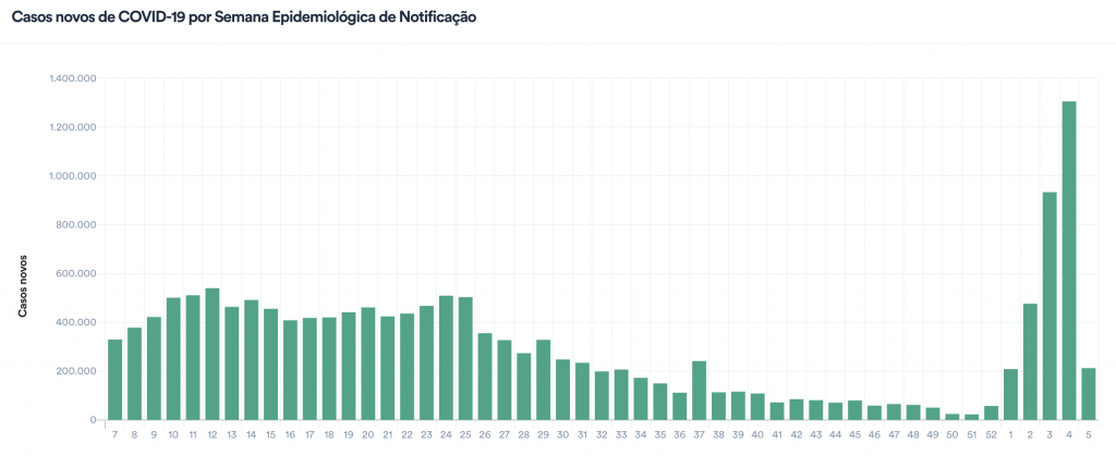 Com isso, a média móvel de casos nos últimos 7 dias foi a 188.451 – a maior marca registrada até aqui e marcando o 14º recorde seguido. Em comparação à média de 14 dias atrás, a variação foi de+125%, indicando tendência de alta nos casos da doença.