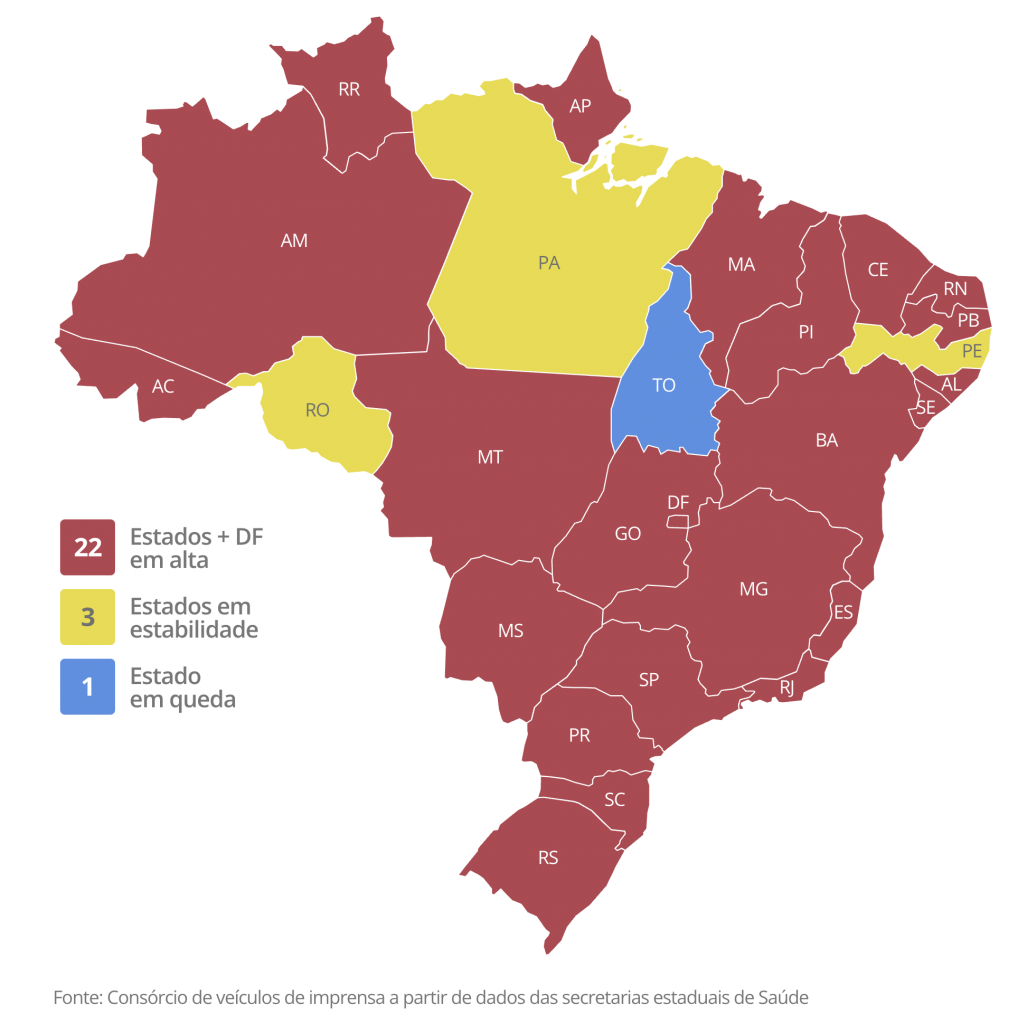 Restam poucos quatro estados que não estejam em aceleração de mortes. São eles Rondônia, Pará e Pernambuco que se mantém estabilizados e Tocantins ainda em queda. Todas as demais 23 unidades da federação só aceleram a curva de mortes para cima.