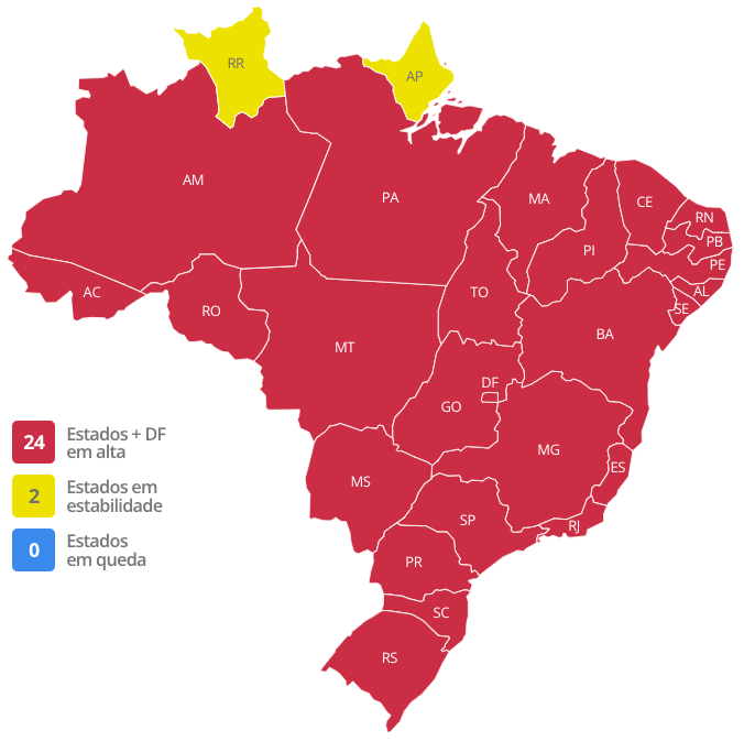 O quadro de aceleração de mortes continua alarmante com 24 estados mais o DF em alta, enquanto apenas Amapá e Roraima estão estabilizados.