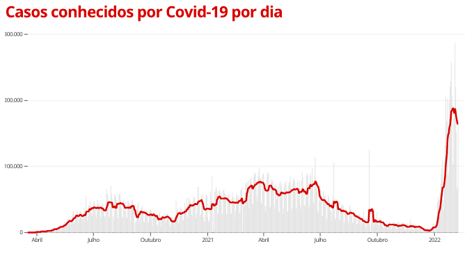 Com isso, a média móvel de mortes nos últimos 7 dias é de 823. –a maior registrada em quase 6 meses, desde 17 de agosto de 2021 (quando estava em 833). Em comparação à média de 14 dias atrás, a variação foi de +123%, indicando tendência de alta nos óbitos decorrentes da doença.