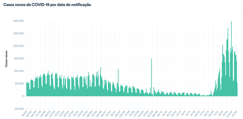 Com isso, a média móvel de casos nos últimos 7 dias foi a 135.205. Em comparação à média de 14 dias atrás, a variação foi de -28%, indicando tendência de queda nos casos da doença pelo 4º dia.