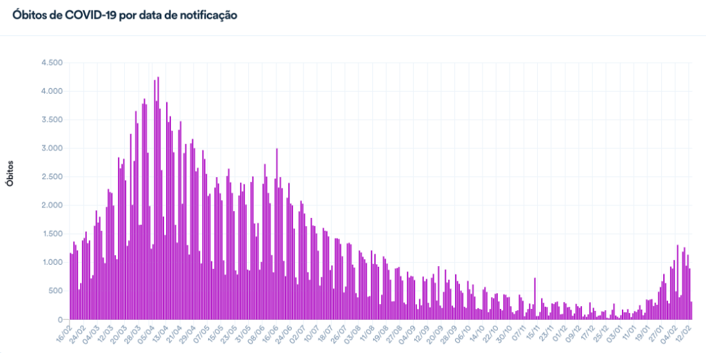 O documento informa 314 mortes em 24 horas. Com isso, a média móvel de mortes nos últimos 7 dias é de 880 – menor que a da véspera, que se aproximava de 900. Em comparação à média de 14 dias atrás, a variação foi de +56%, indicando tendência de alta nos óbitos decorrentes da doença.
