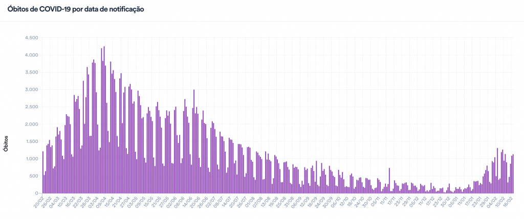 Com isso, a média móvel de mortes nos últimos 7 dias é de 841 –completando 10 dias acima da marca de 800. Em comparação à média de 14 dias atrás, a variação foi de +15%, indicando tendência de estabilidade nos óbitos decorrentes da doença, após 35 dias seguidos em alta.