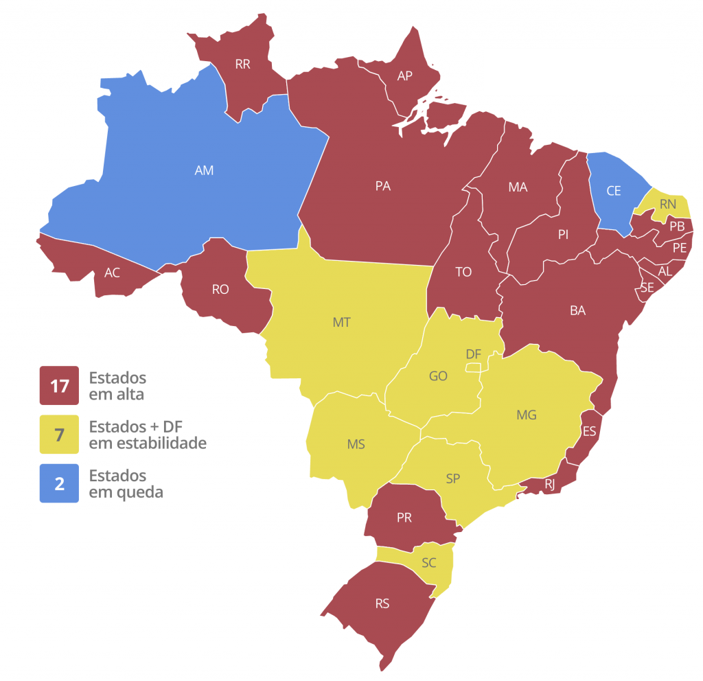 O mapa está mais colorido, embora tenha apenas o Amazonas em desaceleração de mortes. No entanto, dez estados estabilizaram os números (ES, PE, AC, PI, MG, CE, SC, SP, MT, GO).