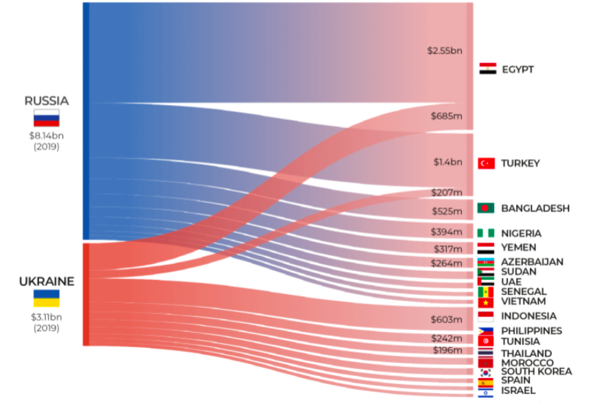 No ano-safra de 2021-22, a Turquia foi o maior comprador de trigo russo, comprando 4,5 milhões de toneladas métricas em 30 de dezembro de 2021. O Egito comprou 3,2 milhões de toneladas métricas da Rússia no mesmo período.