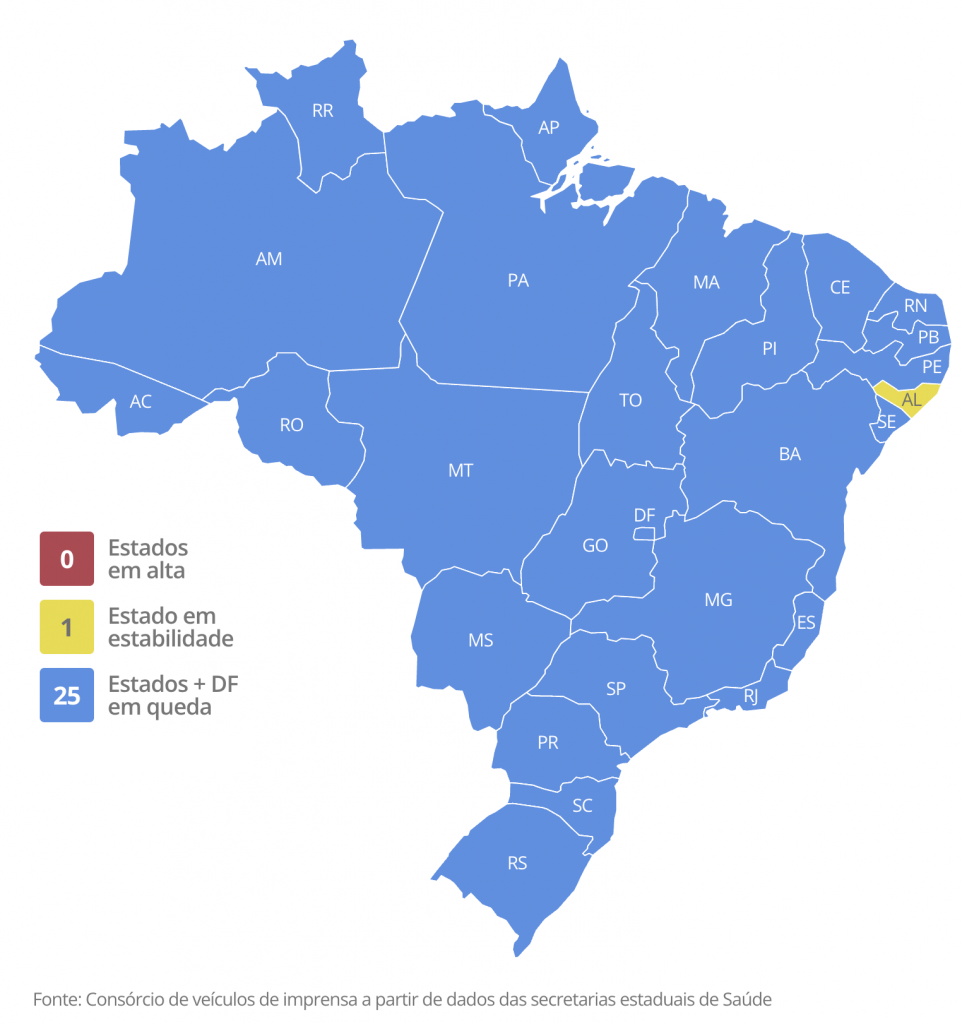 Mais uma vez, não há nenhum estado em aceleração de mortes. Um cenário mantido há vários dias. Apenas Alagoas continua com números estáveis.