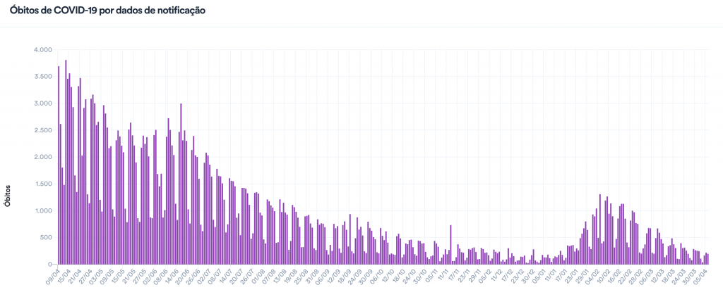 As secretarias municipais e estaduais e o Ministério de Saúde registraram, entre ontem e hoje, que foram notificadas 250 novas mortes. Com isso, a média móvel de mortes nos últimos 7 dias é de 168. Em comparação à média de 14 dias atrás, a variação foi de -33%, o que indica tendência de queda nos óbitos decorrentes da doença.