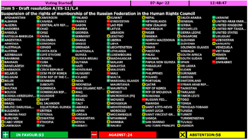 A iniciativa norte-americana teve 93 votos a favor e 24 contrários (entre China, Cuba, Bolívia e Vietnã). Cinquenta e oito países se abstiveram, incluindo o Brasil, mas seus votos não contaram para a contagem final. Uma maioria de dois terços dos membros votantes foi necessária para suspender a Rússia do conselho de 47 membros.