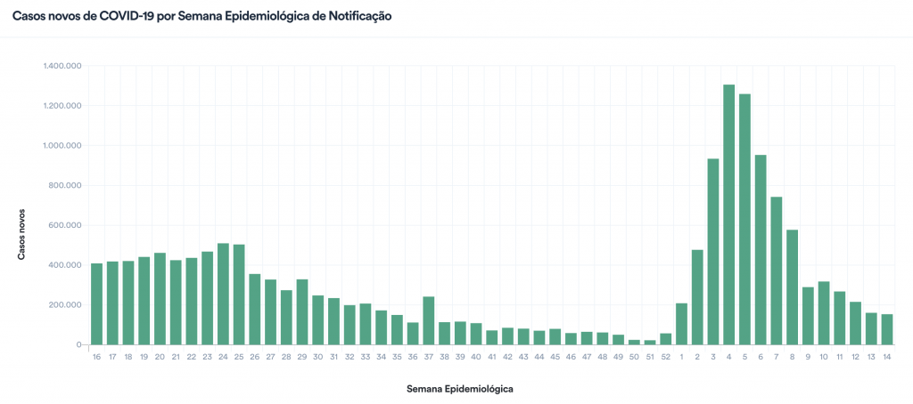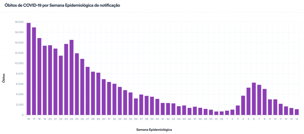 No fechamento desta 14a. semana epidemiológica de 2022, a queda de 17,38% nos óbitos tem sido constante em relação às semanas anteriores.