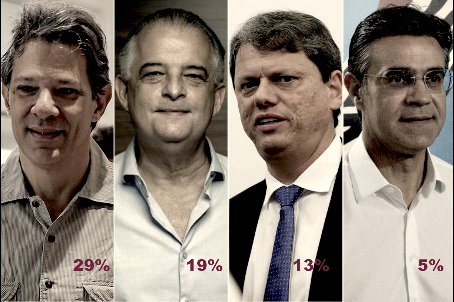 Fernando Haddad, com o apoio de Lula e Alckmin vai a 39%, Tarcísio de Freitas, com o apoio de Bolsonaro sobe de 13% a 29% e Rodrigo Garcia, com o apoio de Doria, sobe a 11%.