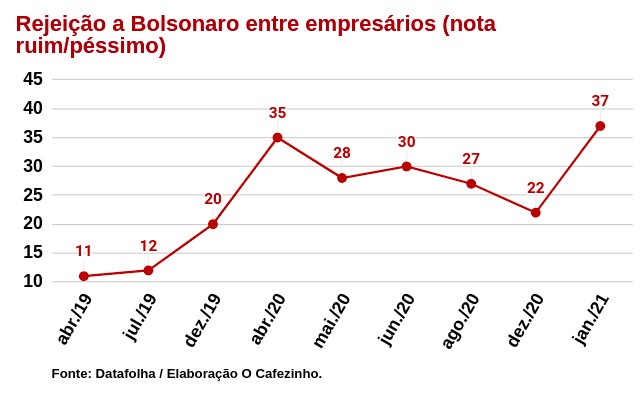 A continuidade da recessão e a falta de perspectivas para sua superação parecem ter subido ao andar de cima. Finalmente, parece ter caído a ficha para esse pessoal que a continuidade da política econômica de Guedes não cria demanda capaz de apontar alguma luz no final do túnel. Além disso, as elites empresariais começam a sentir a chegada da doença em seus redutos, ainda que os condomínios sejam cercados por muros elevados e fortes esquemas de segurança reforçada. Seus planos de saúde, antes aceitos pelos hospitais mais caros do país, não mais servem para abrir leitos nas UTIs lotadas. O colapso do sistema de saúde afeta a todos. O gráfico abaixo é um belo exemplo da tendência de reprovação do governo também nesse meio empresarial. Ao longo de dois anos, a rejeição mais do que triplicou.