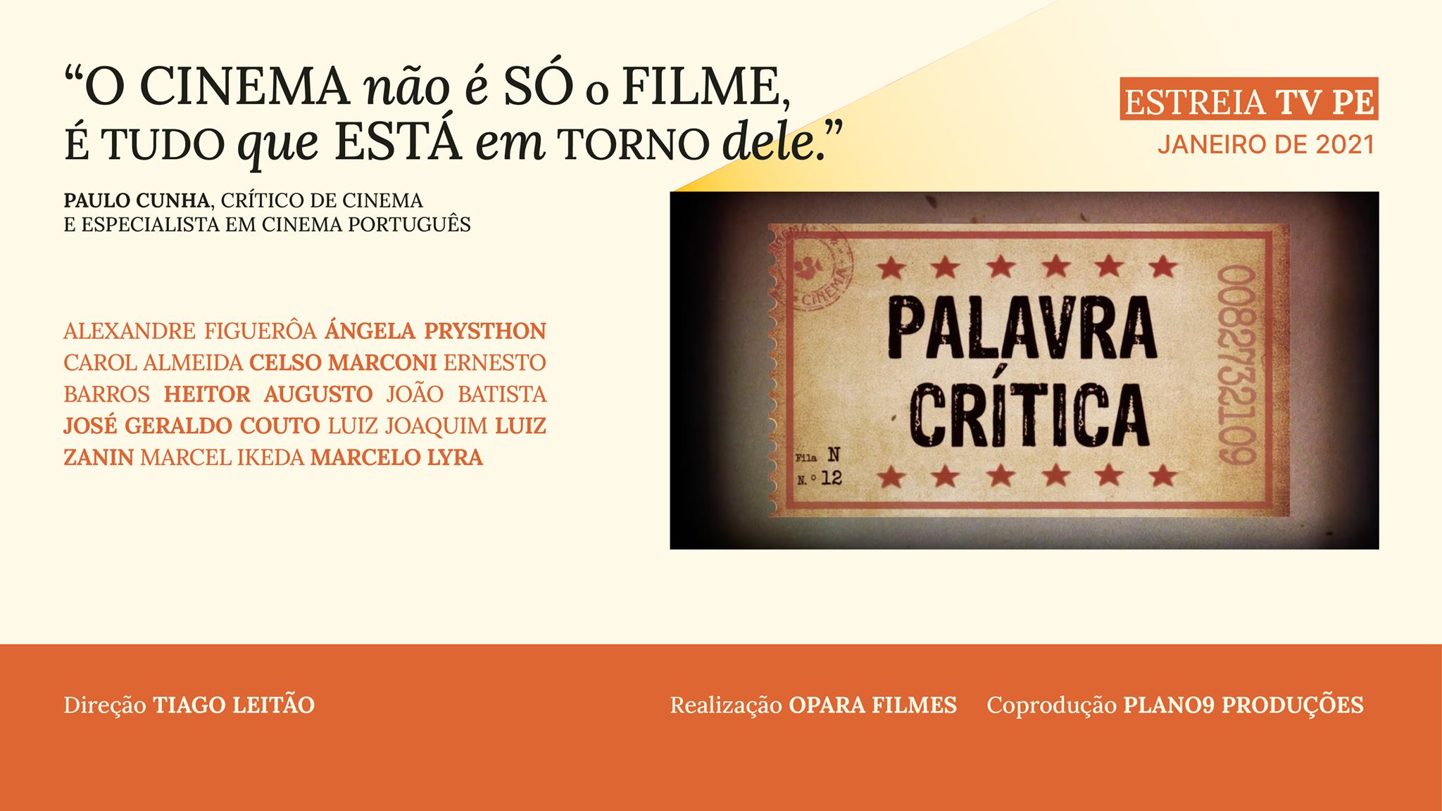 Algo que destaco da série Palavra Crítica é a edição. Vi os 12 episódios e senti como a visão colocada para a montagem teve a possibilidade de juntar o que havia de mais expressivo sido dito pelos entrevistados. Esse trabalho, pelo que entendi, foi principalmente feito ou pelo menos orientado pelo produtor principal da série, o cineasta Tiago Leitão.