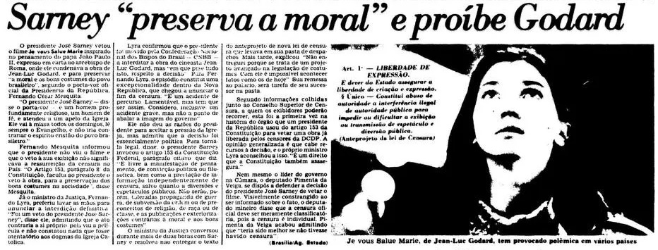 9) Em 1988, após uma série de vistorias de fachada, o prefeito de São Paulo, Jânio Quadros, mandou interditar oito cinemas paulistanos por supostas “falhas de segurança”. O motivo real era outro: as oito salas exibiam o herético A Última Tentação de Cristo, o filme de Martin Scorsese que, segundo Jânio, “desrespeitava a fé cristã”. Dado a arroubos autoritários, Jânio foi acusado de ressuscitar a censura em plena redemocratização. Em sua defesa, ele lembrou que apenas dois anos antes, mesmo com a ditadura militar sepultada, o presidente José Sarney proibiu a exibição de um filme de Godard em todo o território nacional. Je Vous Salue, Marie foi censurado no começo de 1986 “para preservar a moral”. O porta-voz da Presidência admitiu que Sarney sequer havia visto o filme, mas “atendeu a um apelo da Igreja”. Naquele ano, numa espécie de “trote cultural”, alunos da PUC-SP decidiram mostrar o filme para os “calouros” da universidade – que, por sinal, é católica. A sessão clandestina já tinha passado da metade quando a Polícia Federal invadiu a PUC, disparou tiros para o alto, agrediu estudantes e recolheu as cópias do filme.